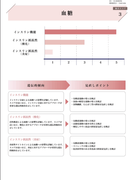 インスリンは体内で唯一、血糖値を下げるホルモンです。遺伝的にインスリンの分泌が少ない、あるいは効きにくい体質だと、同じ食事でも血糖が上がりやすく、下がりにくくなります。長期的には体脂肪の蓄積や将来の生活習慣リスクに結びつくため、「血糖値とどう付き合うか」を早い段階から整えることが大切です。自分では気にもしていなかったインスリン機能にリスクがあると知れたことで、ダイエットだけではなく今後の将来的なリスクを知ることができました。