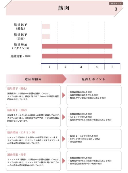 筋肉・骨・脂肪代謝・血糖・ストレス・睡眠・美容・ホルモンなど約50項目。体質の“得意・不得意”を知り、「今の生活で何を意識するか」が明確になります。